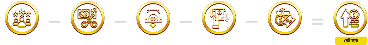 ((গ্রাহকের জয়/ক্ষতি – 19% কর্তন – 2% জমার পরিমাণ – 1.5% উত্তোলনের পরিমাণ – বোনাস = নেট লাভ))